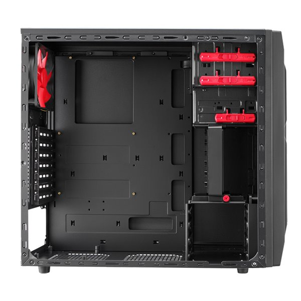 Černá počítačová skříň formátu Middle Tower. Na předním panelu naleznete dva porty USB 2.0 a jeden port USB 3.0, dále také konektor pro sluchátka a konektor pro mikrofon. Skříň je dodávána bez zdroje.
