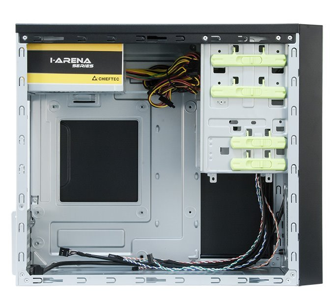 Černá počítačová skříň formátu Mini Tower. Vybavena je 350 W zdrojem, který nabízí standardní konektory pro napájení všech komponent. Na horním panelu naleznete jeden port USB 3.0, dva porty USB 2.0, konektor pro sluchátka a konektor pro mikrofon.