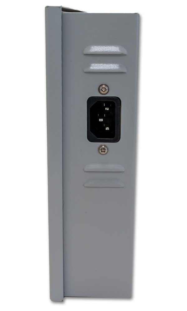 Stabilizovaný napájecí zdroj pro šestnáct spotřebičů, nastavitelné napětí DC 11-14 V, každý port max. 1,5 A. Celkový výstupní proud 12 A. Skříňka na zeď s instalovaným PCB, kabelové průchodky. Připojení kabelů k interní svorkovnici. Ochrana proti zkratu PTC termistory, 1,5 A na port. LED signalizace funkčnosti portů.