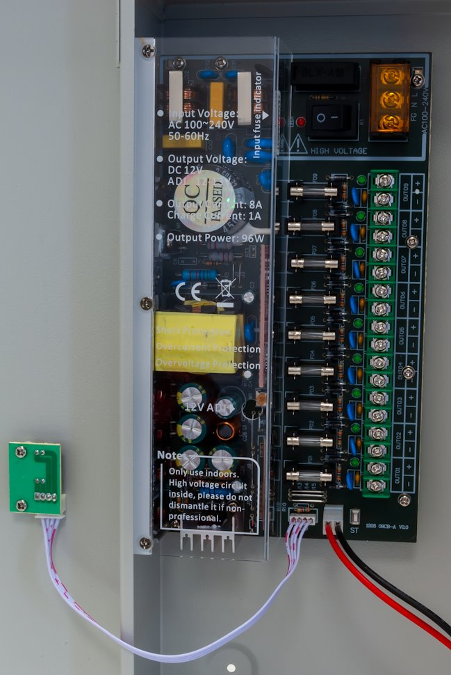 Stabilizovaný napájecí zdroj pro devět spotřebičů s okruhem pro nabíjení a připojení záložní baterie. Nastavitelné výstupní napětí DC 12-13 V, každý port max. 1,5 A. Celkový výstupní proud 8 A. Skříňka na zeď s instalovaným PCB, kabelové průchodky. Připojení kabelů k interní svorkovnici. Ochrana proti zkratu přístrojovou pojistkou, ochrana proti přepětí. LED signalizace funkčnosti portů.