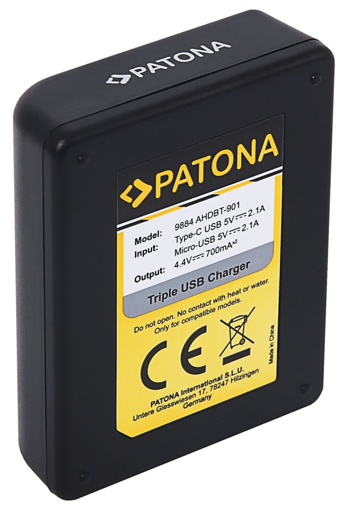 S nabíječkou Patona Triple lze nabíjet 3 baterie AHDBT901 nebo ADBAT001 současně, a to z jakéhokoliv USB výstupu. Disponuje konektory micro USB a USB typu C. Nabíječky jsou vyráběny dle nejvyšších evropských standardů kvality a vyznačují se extrémně dlouhou životností.