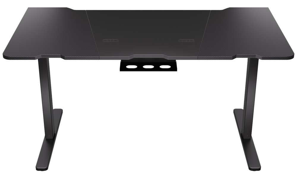 Herní stůl o délce 150 cm a šířce 78 cm nabízí dostatek prostoru pro myš, klávesnici a další příslušenství. Výšku lze plynule nastavit v rozsahu 73 až 120 cm pouhým stisknutím tlačítka na ovládacím panelu, který navíc umožňuje uložit až čtyři nastavení výšky. Na spodní straně desky je umístěn systém pro správu kabelů. Maximální stabilitu zajišťuje robustní ocelová konstrukce s nosností až 80 kg. Povrchová úprava desky stolu ve stylu uhlíkových vláken nejen dobře vypadá, ale je také odolná proti poškrábání. V neposlední řadě zajisté potěší kovová polička pro napájecí lištu na zadní straně a háček pro zavěšení sluchátek.