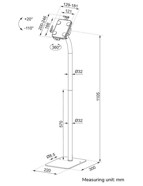 Podlahový stojan pro tablet s úhlopříčkou 7,9" až 11" umožňuje pohodlné nastavení náklonu v rozsahu 130° a rotaci 360°. Protiskluzové podložky chrání tablet před jakýmkoli poškrábáním, zatímco výškově a šířkově nastavitelné svorky zajišťují jeho bezpečné a pevné umístění. Kabely lze úhledně vést pomocí vnitřního systému správy kabelů.