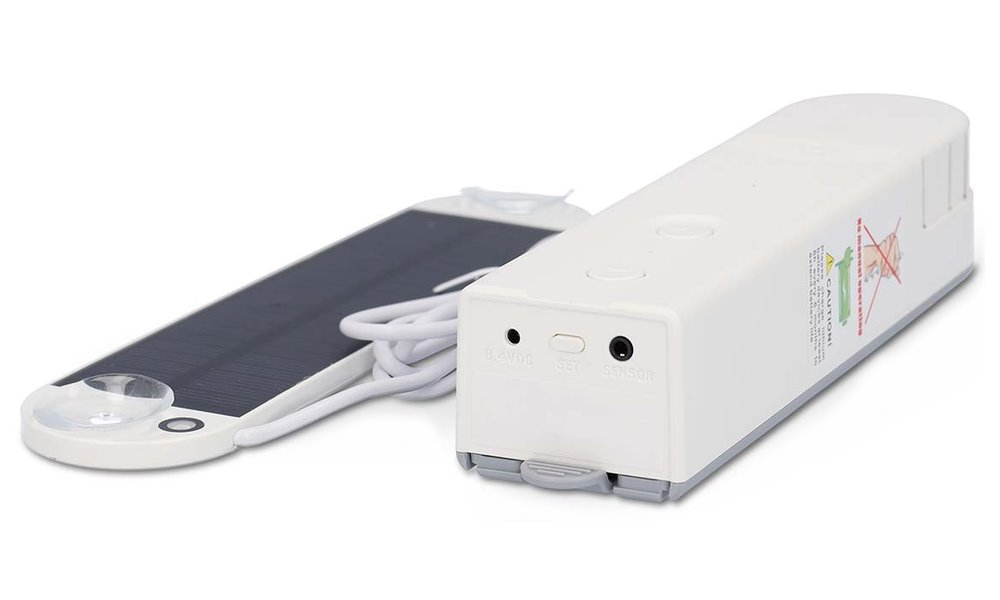 Součástí balení je montážní konzole, solární panel s přísavkami a síťový adaptér.