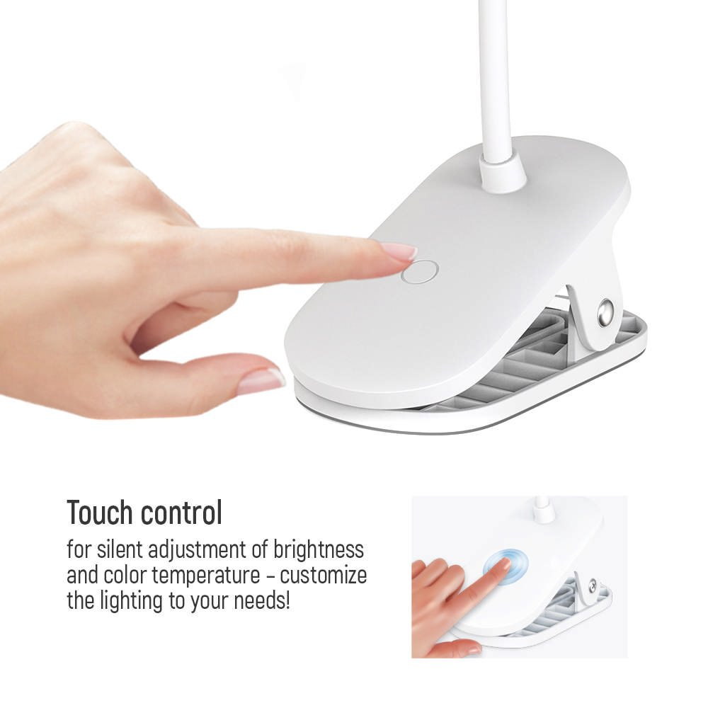 Klipová lampička vhodná nejen na čtení nabízí 24 LED, světelný tok 100 lm a výkon 3,5 W. Integrovaná baterie s kapacitou 1 800 mAh zajistí až 7 hodin svícení a poté ji jednoduše nabijete pomocí přiloženého USB kabelu. Jednoduché ovládání poskytuje dotykové tlačítko, díky kterému lze upravit jas a teplotu barev. Díky klipu lze lampu upevnit na různé předměty: police, postel nebo hrana desky stolu. Flexibilní 360° rameno umožňuje přizpůsobit úhel osvětlení jakýmkoli potřebám.