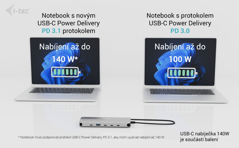 Pokud váš notebook nebo tablet podporuje nový a moderní nabíjecí protokol USB-C Power Delivery PD 3.1, dokovací stanice nabídne nabíjecí výkon až 140 W (pokud máte protokol PD 3.0, nabíjecí výkon bude až 100 W).