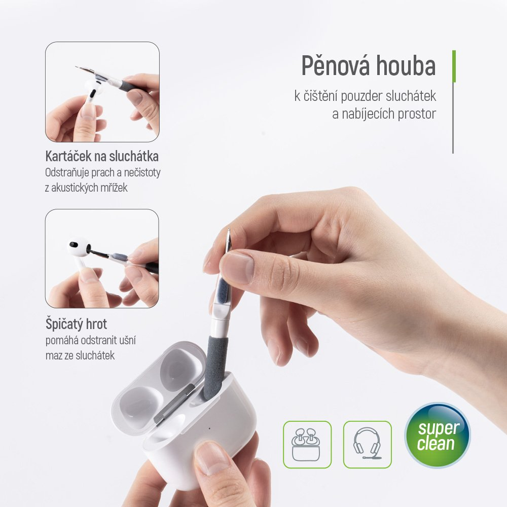 • Měkká houbička – ideální pro čištění krytů sluchátek a nabíjecích prostor.
