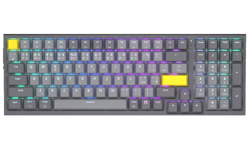 Moderní mechanická klávesnice navržená pro uživatele, kteří hledají dokonalou kombinaci kompaktního designu, pohodlí a technické preciznosti. Díky univerzálnímu rozložení typu 1800 s plnohodnotným numerickým blokem poskytuje veškeré funkce klasické klávesnice, a přitom šetří místo na stole. Kompatibilita se systémy Windows, macOS, Linux i Android umožňuje flexibilní využití napříč zařízeními, přičemž přepínání mezi nimi je otázkou sekund díky podpoře Bluetooth, 2,4GHz donglu a USB připojení. Výkonná baterie vydrží na jedno nabití až 120 hodin provozu, což zajišťuje dlouhodobé používání bez nutnosti častého dobíjení.