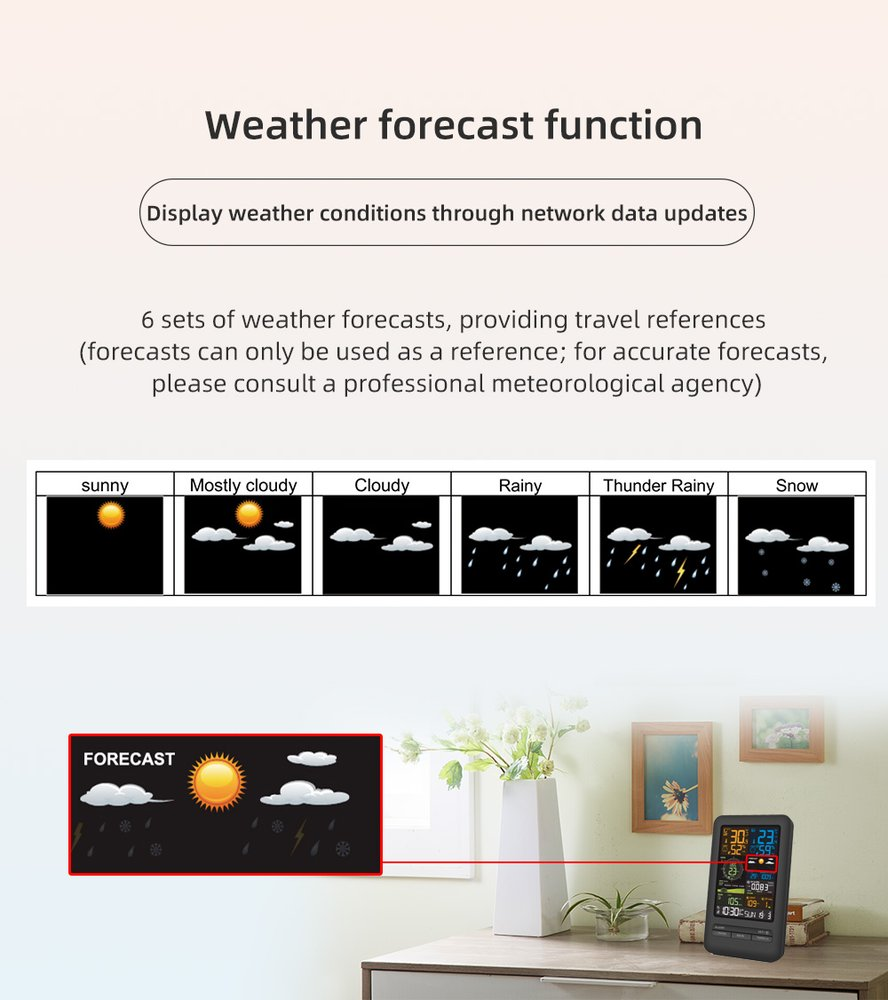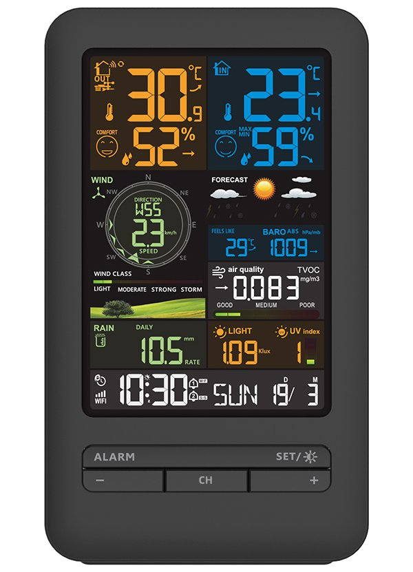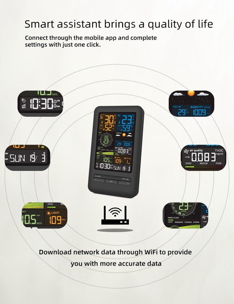 Řídící jednotka se připojuje k Wi-Fi 2,4 GHz a umožňuje dálkové sledování a ovládání přes aplikaci Tuya Smart. Stanice je plně funkční i bez připojení k internetu. Vnitřní jednotka obsahuje synchronizované hodiny, budík a automatické stmívání displeje.