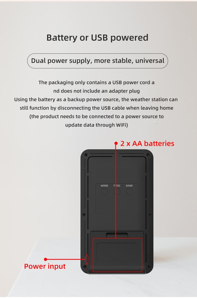 Napájení vnitřní jednotky: 5 V DC a 2× AA baterie (USB adaptér není součástí)