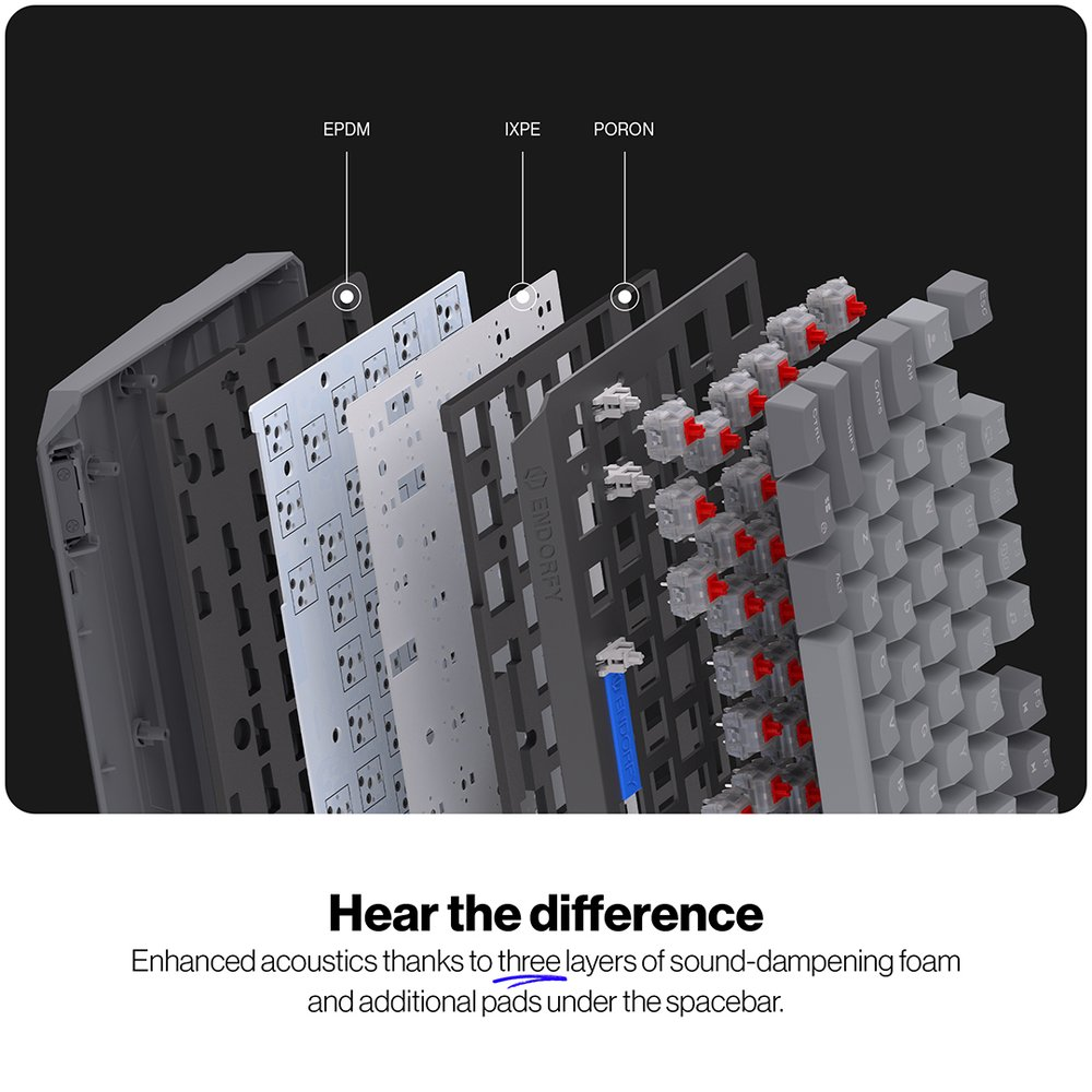 Robustní konstrukce s hliníkovou horní deskou zajišťuje dlouhodobou spolehlivost a prémiový pocit z používání. Pokročilý akustický systém se třemi vrstvami pěny (PORON, EPDM, IXPE) minimalizuje nežádoucí vibrace a ozvěnu pro čistý zvukový projev při psaní.