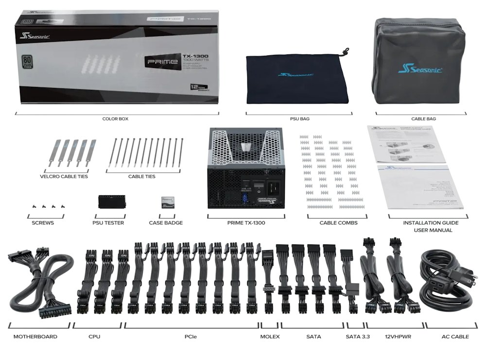Konektory: 1× 24pin ATX, 3× EPS/ATX 12 V, 2× 12VHPWR (12+4pin), 8× PCIe (8pin), 10× SATA, 3× Molex