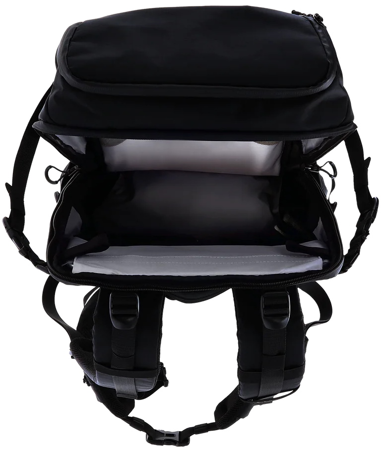 Hlavní komora o objemu 35 litrů disponuje dvěma přístupy – můžete ji otevřít shora bez nutnosti pokládat batoh, nebo ji rozložit zezadu pro pohodlný přístup k celému obsahu. Vyjímatelná přepážka umožňuje oddělit fotografickou výbavu od ostatních věcí nebo ji zcela odstranit a vytvořit jeden velký prostor. Přední kapsa nabízí vyhrazené oddělení pro laptop nebo tablet do 16" a další menší kapsy pro kabely, akumulátory a drobné příslušenství.
