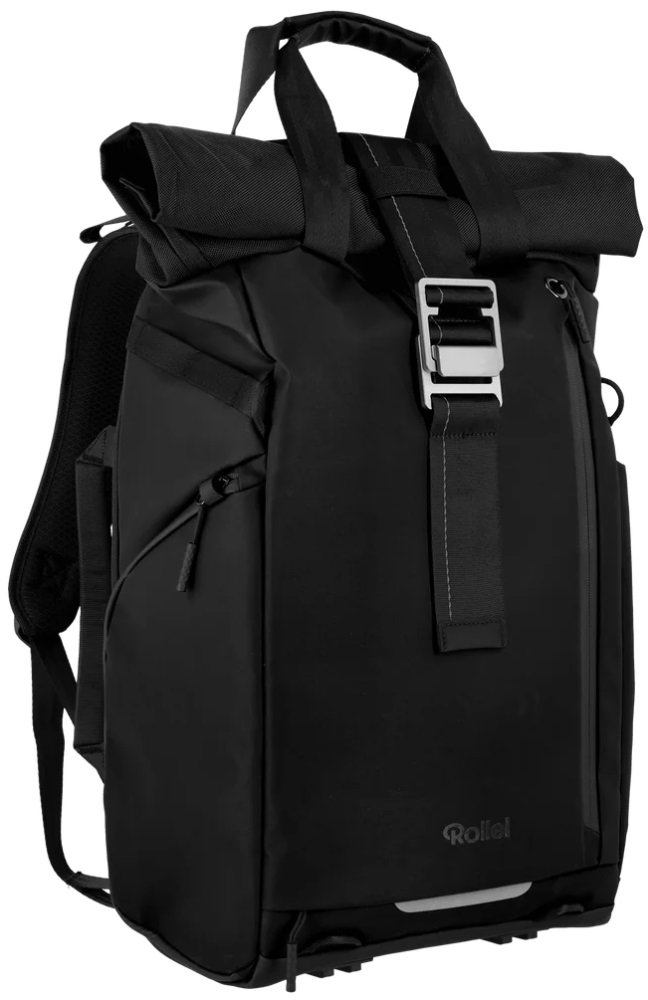 Univerzální fotobatoh v černé barvě s flexibilním úložným prostorem a rolovacím vrchem pro fotografy, cestovatele a každodenní použití.