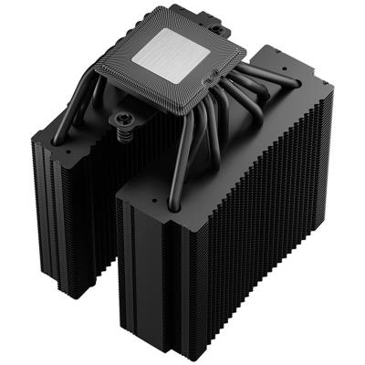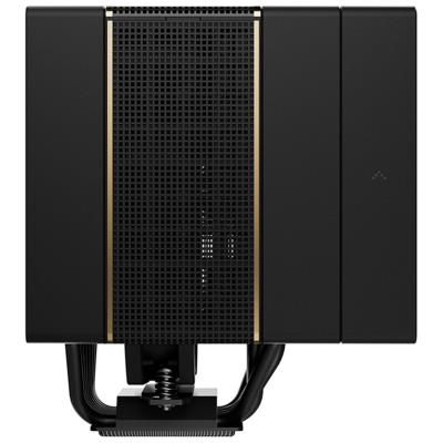 Centrálně umístěný 140mm ventilátor zasahuje hluboko do srdce chladiče a vytváří sekundární proudění vzduchu, které dodatečně chladí okolní VRM komponenty na základní desce. Čistý a elegantní kryt pomáhá směrovat vzduch skrz věže žeber.