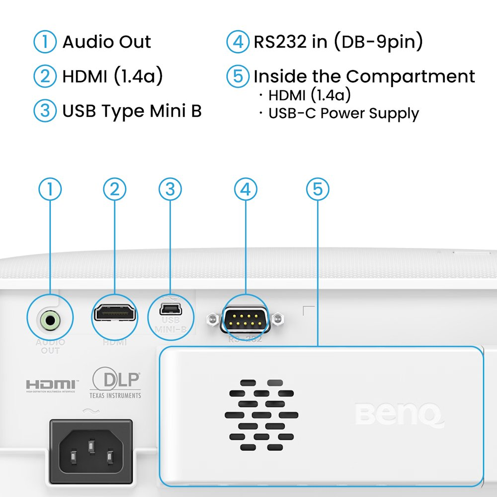 Projektor nabízí 2× HDMI 1.4 (jeden v kryté sekci), USB mini B, RS232, USB-C pro napájení Google TV donglu a Audio Out výstup. Podporuje rozlišení od VGA (640 × 480 px) až po WUXGA (1920 × 1200 px) s horizontální frekvencí 15–102 kHz a vertikální 23–120 Hz.