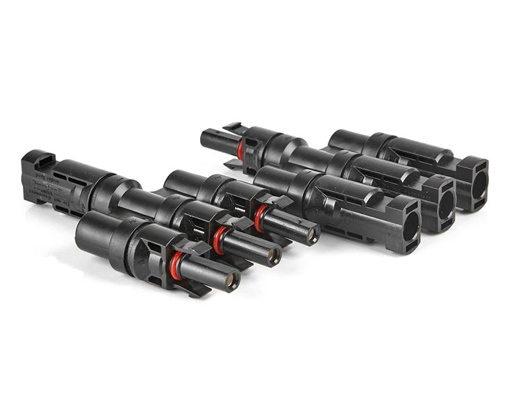 Solar T connector type MC4 designed for parallel connection of solar panels. It is made of highly durable plastic and is equipped with rubber sealing inserts. Suitable for outdoor applications.
