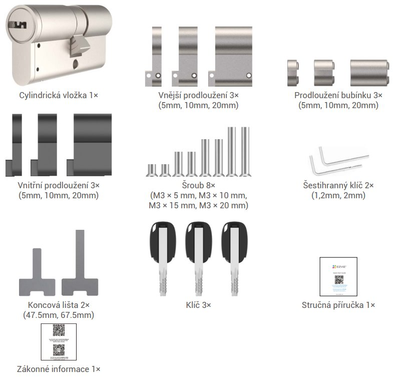 The cylindrical lock cylinder with through coupling is compatible with the EZVIZ DL01S smart lock. The modular solution with adjustable length can be adapted to most doors, thanks to up to 16 possible cylinder dimensions. The durable construction with brass body and zinc alloy extensions prevents forced entry. The package includes 3 keys.