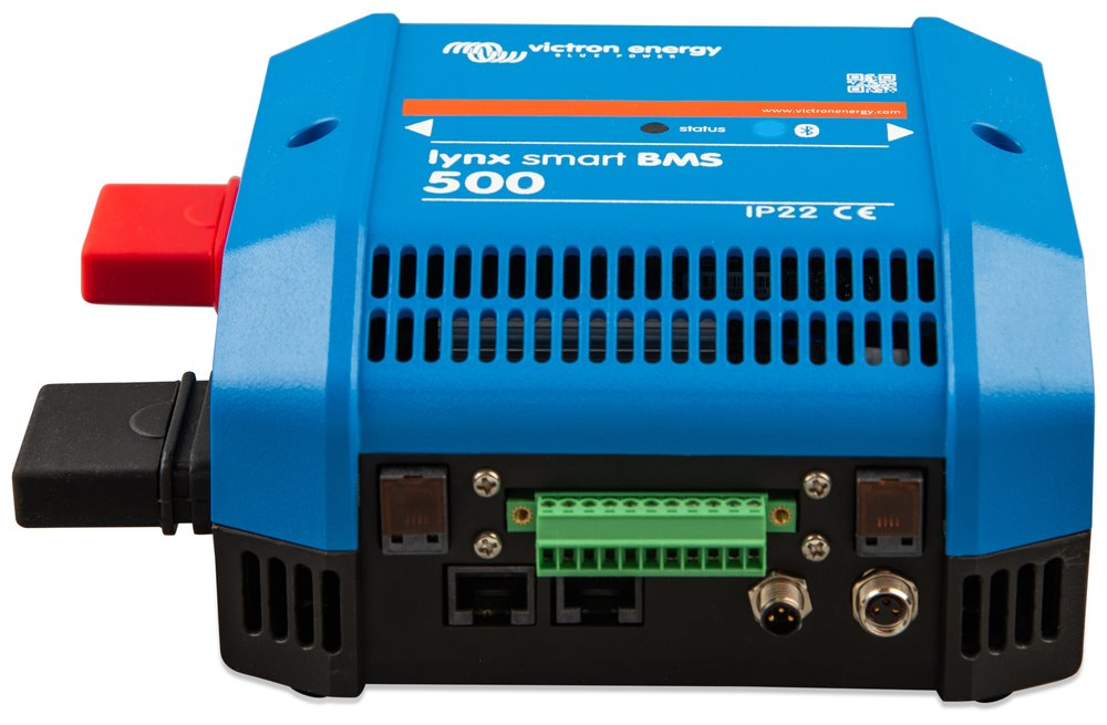 The Lynx Smart BMS is a dedicated Battery Management System (BMS) for the Victron Smart lithium batteries. These batteries are Lithium Iron Phosphate (LiFePO4) batteries and are available in 12.8V or 25.6V in various capacities. They can be connected in series, parallel and series/parallel so that a battery bank can be built for system voltages of 12V, 24V or 48V. The maximum number of batteries in one system is 20, which results in a maximum energy storage of 84kWh in a 12V and up to 102kWh in a 24V and 48V system.