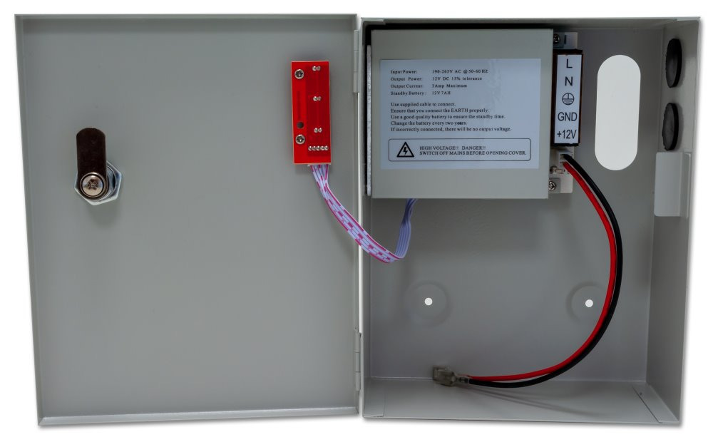 Stabilizovaný napájecí zdroj s jedním výstupem, s okruhem pro nabíjení a připojení záložní baterie. Celkový výstupní proud 3 A. Skříňka na zeď s instalovaným PCB, kabelové průchodky, vypínač uvnitř skříňky. Připojení kabelů k interní svorkovnici, možnost odpojení výstupu propojkou bez nutnosti odpojování vodičů. Ochrana proti zkratu přístrojovou pojistkou, ochrana proti přepětí. LED diody diagnostikují stav portů, na první pohled je např. rozpoznatelná vyhořelá pojistka. Bateriový okruh dobíjen 1 A. Ochrana proti zkratu baterie a ochrana baterie proti úplnému vybití.