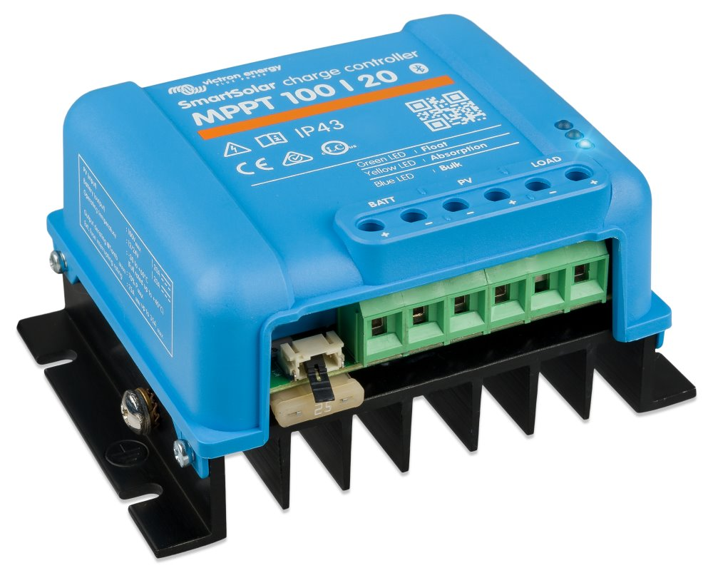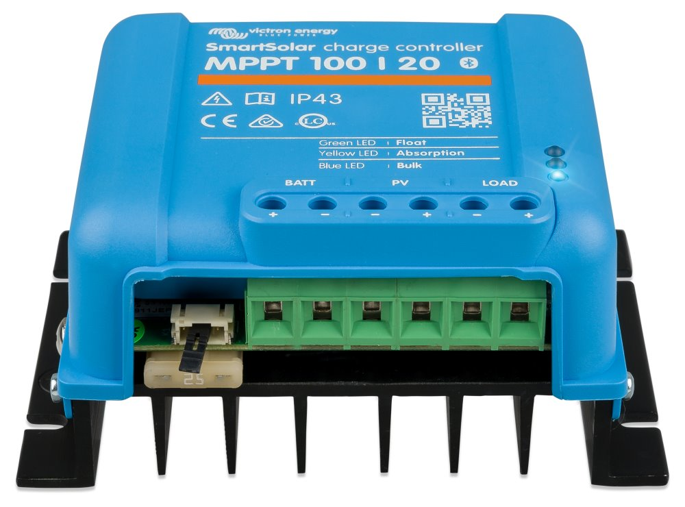 Robustní a rychlý MPPT regulátor pro náročné podmínky s napětím panelů až 100 V, maximální nabíjecí proud 20 A. Baterie 12/24/48 V, FV max. 290/580/1160 Wp. Vestavěné Bluetooth a VE.direct rozhraní.