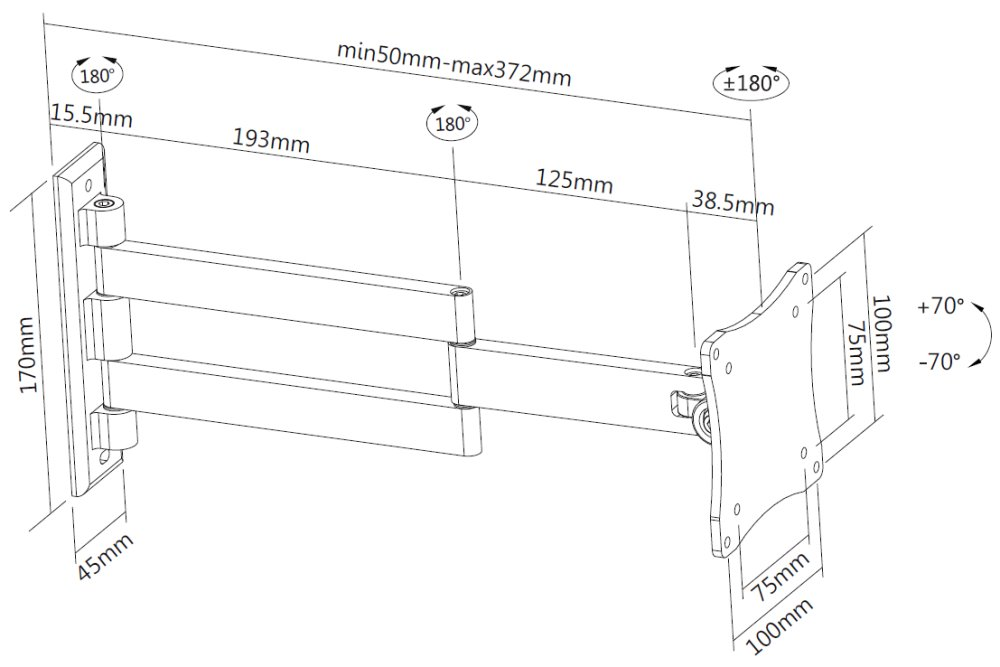 Sklopný a otočný nástěnný držák pro ploché obrazovky s úhlopříčkou od 10" do 27" a hmotností až 12 kg umožňuje snadné nastavení náklonu i horizontálního otočení monitoru. Hloubka držáku je nastavitelná od 5 do 37 cm. Možnost náklonu -70° až +70° a otáčení -90° až +90° umožňuje nastavit ten nejlepší úhel pohledu pro maximální flexibilitu při sledování obrazovky. Držák je kompatibilní se standardy VESA 75 × 75 až 100 × 100 mm.