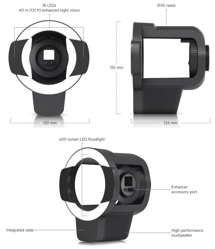 IR LED světlo/přísvit s dlouhým dosahem a světlomet (FloodLight) pro kameru UniFi AI Professional. Integrovaný radar zvyšuje přesnost detekce a umožňuje měřit vzdálenost osob až na 20 m a vozidel až na 35 m. Disponuje také výkonným vestavěným reproduktorem. Světlo je odolné vůči povětrnostním vlivům (IPX5).