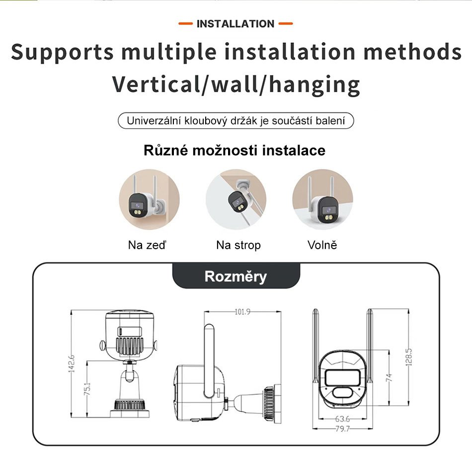 Rozměry: 75 × 65 × 65 mm (bez antény a držáku)