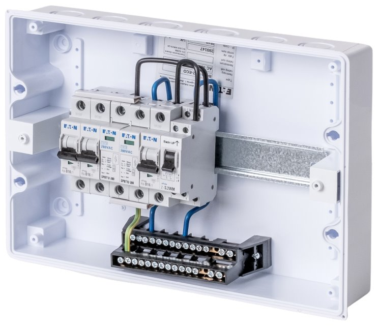 V rozvaděči je osazen jistič B16/1 pro jištění vstupu do střídače a výstupu pro zálohované okruhy. K dispozici je také manuální dvoupolový přepínač pro přemostění zálohovaných okruhů v době servisu nebo vypnutí střídače.