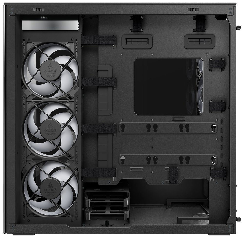 Skříň podporuje instalaci radiátorů až 360/420 mm jak nahoře, tak na boku. Předinstalované ventilátory P12 Pro (vzadu) dosahují 3000 ot./min s průtokem 131 m³/h, zatímco boční P14 Pro Reverse ventilátory nabízejí 166,5 m³/h při 2650 ot./min.
