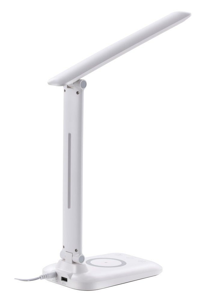 Stolní lampička, LED, 7W, 300lm, stmívatelná, Qi nabíjení, USB výstup 5V/1A, dotykové ovládání, nastavitelné rameno, bílá