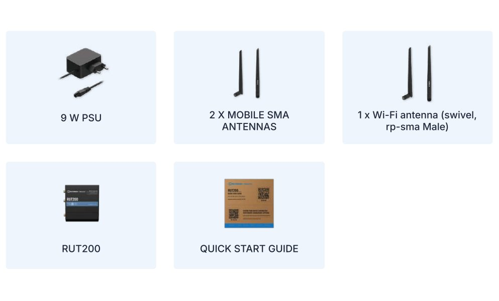 RUT200, napájecí adaptér 9 W, 2× mobilní SMA anténa, 1× Wi-Fi anténa (otočná, RP-SMA samec), quick start guide.
